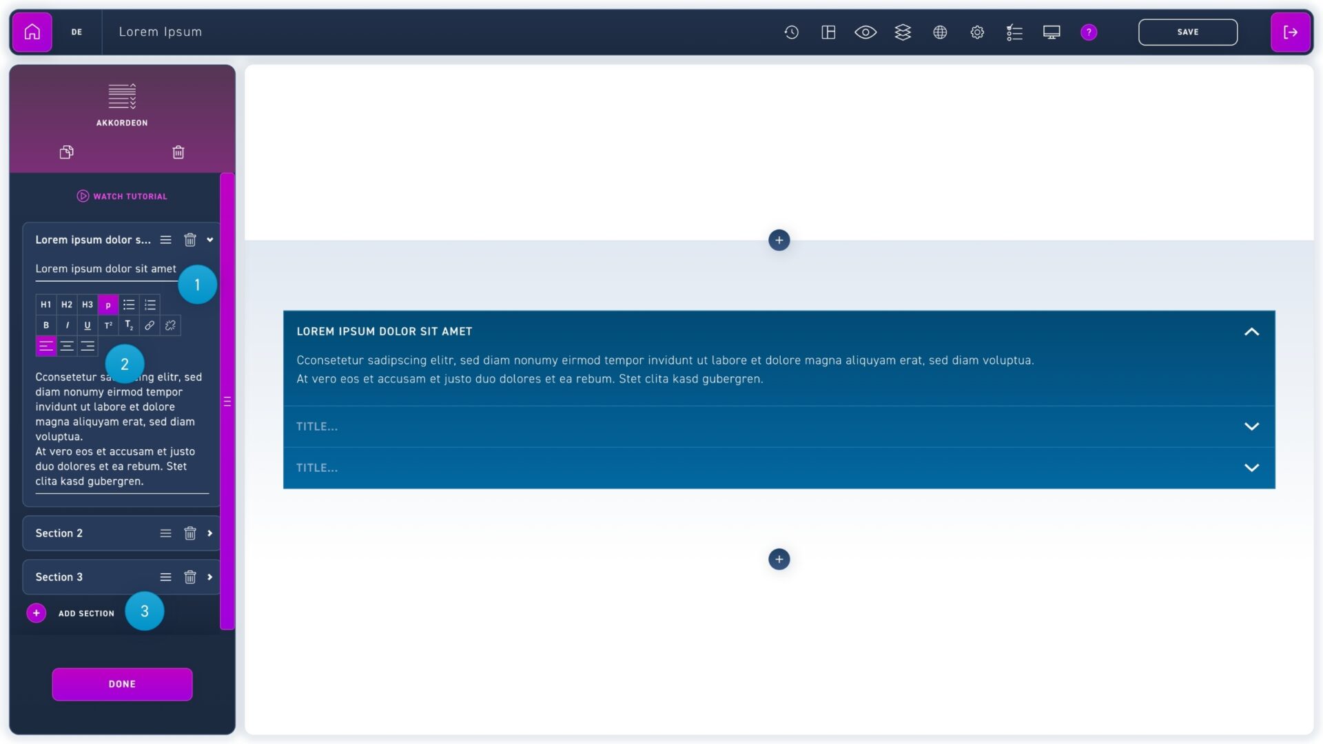 The accordion is the perfect element to present a lot of text content compactly. Divide your content into small segments with sublines. The individual segments can be opened and closed using the arrow symbol.