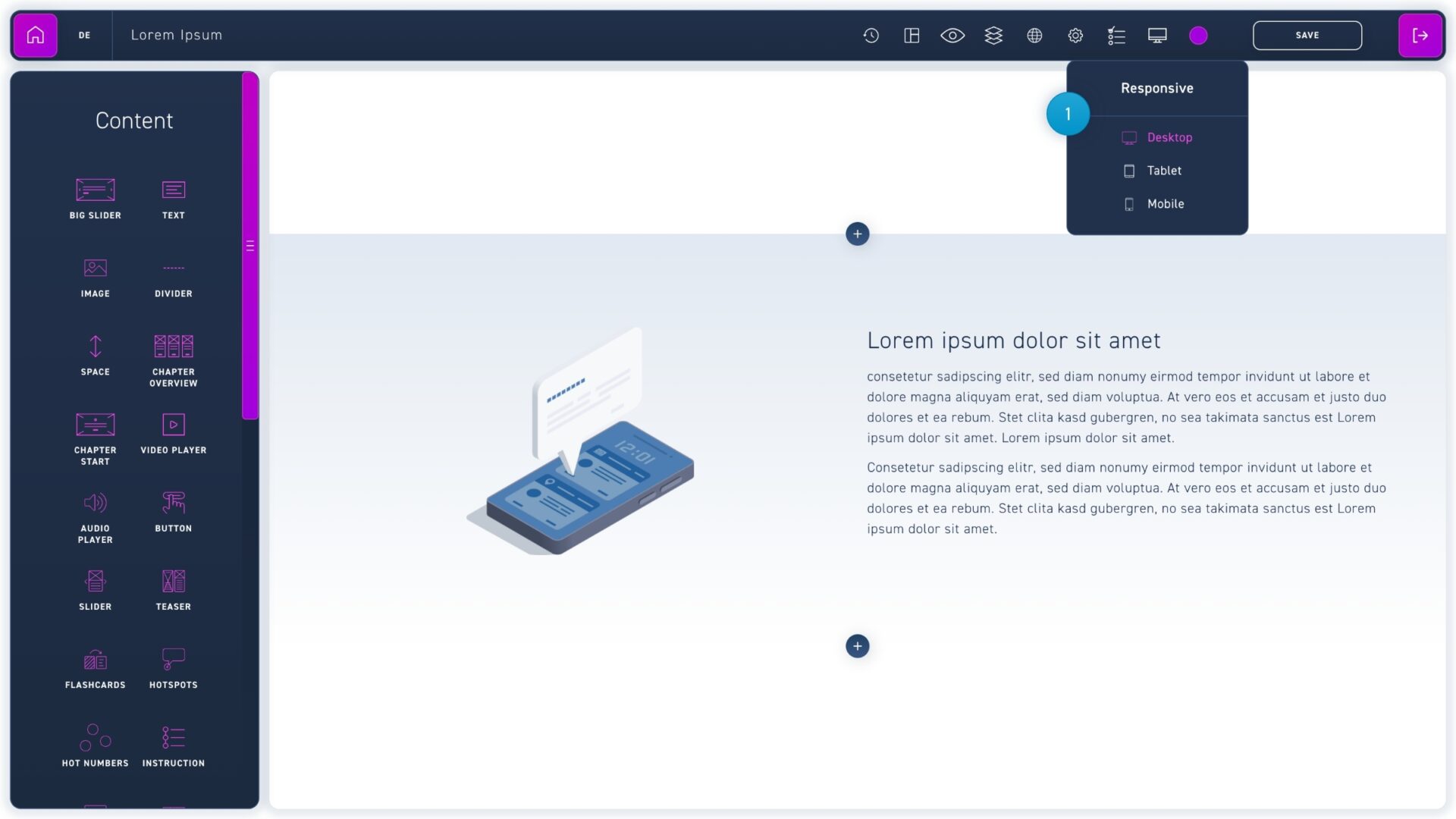 Click on the monitor icon in the menu bar to see how your WBT looks on different display sizes. Select the desired display from the dropdown. Your view will now adapt to the corresponding device.