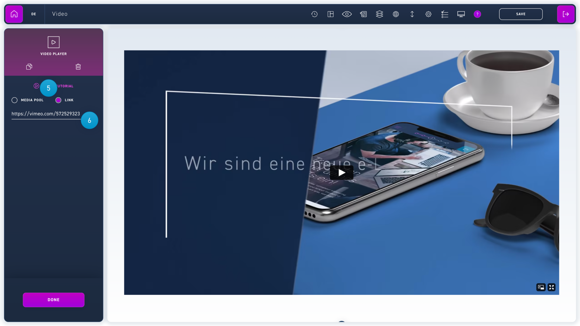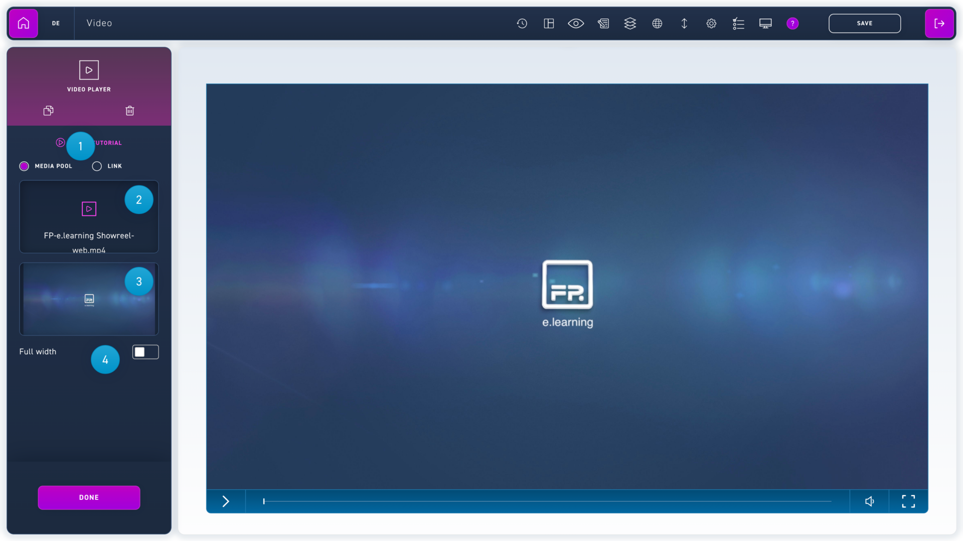1. Use the radio buttons to choose, whether the video will be loaded from the media pool or an external source.